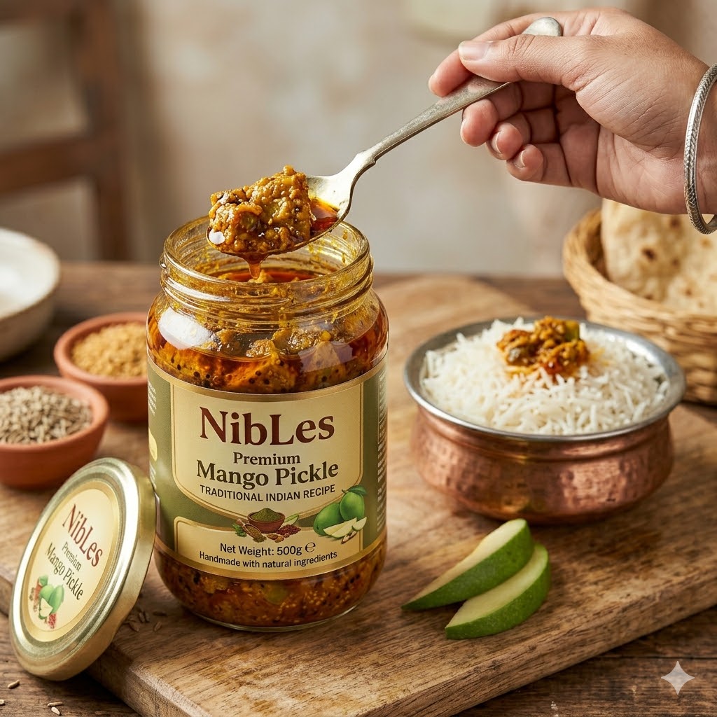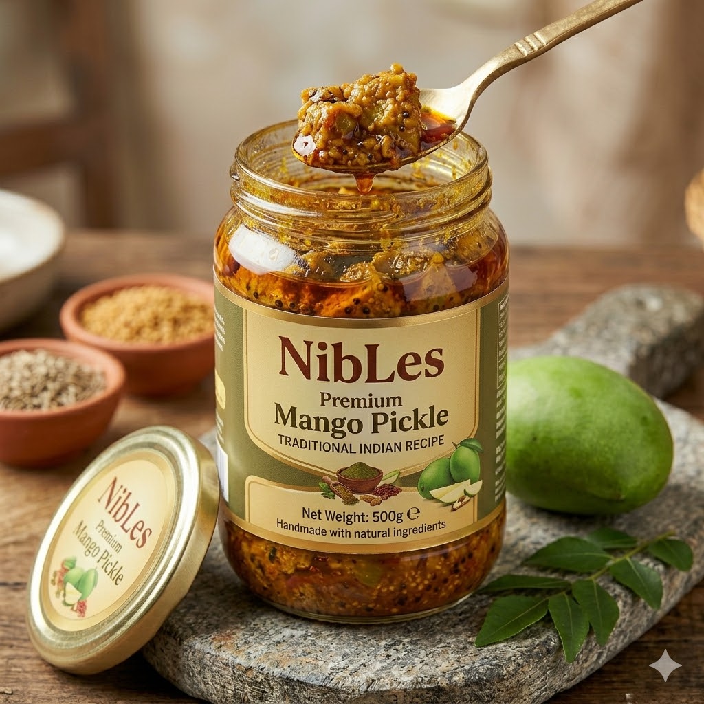 Experience the bold and tangy flavors of NibLes Premium Mango Pickle. Handcrafted using sun-drenched raw mangoes and traditional Indian spices, it brings the nostalgic taste of homemade perfection to your table.